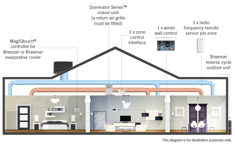 Braemar Dominator uses reverse-cycle technology to deliver a powerful replacement for your gas ducted heater. The idea is centred around using the Braemar Dominator as a replacement for your gas ducted heating system and then continuing to use your evaporative cooling system during summer, meaning you have the most efficient whole house solution no matter what time of year it is. However, the benefit of Braemar Dominator is that it does also have refrigerated cooling built in to use on the days that the air is too humid for evaporative cooling to function. It also has the versatility of being able to be installed in two different applications, besides both in the roof or under floor.