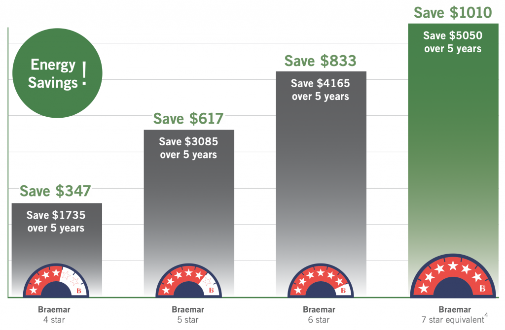 Choosing a new gas ducted heating system or charging over your existing gas ducted heater can be a difficult decision making process. As a Seeley Internaltional Climate Master we are confident that we have a gas ducted heater to suit every budget and requirement. Braemar has a range of heaters starting from your basic 3 star heater, then moving all the way up to a 7 star equivalent rating. You could save between $347-$1010 per year on your gas bill by selecting a higher entry efficient option.
